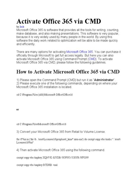 Activating Microsoft 365 on Windows 10 using CMD is a straightforward process that can be particularly useful for IT professionals and those comfortable with command-line interfaces. By following the steps outlined in this article, you can quickly and efficiently activate your subscription and start using the full suite of Microsoft Office applications. Remember to ensure you have a valid subscription, administrator privileges, and a stable internet connection before you begin. And if you encounter any issues, don’t hesitate to troubleshoot using the tips provided or explore alternative activation methods. Happy activating, folks! With these tips, you should be able to activate Microsoft 365 on Windows 10 using CMD without any issues. Always remember to run Command Prompt as administrator for the process to work smoothly.