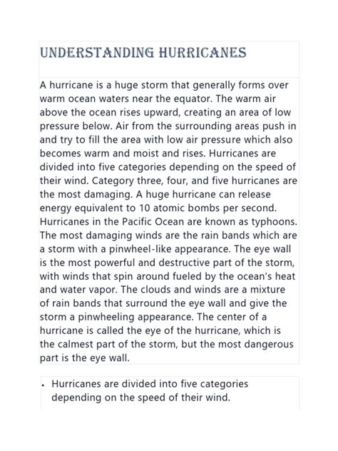 Now, about those wind speeds - that’s how we categorize the intensity of a hurricane. The Saffir-Simpson Hurricane Wind Scale is the go-to system. It ranges from Category 1 (the weakest) to Category 5 (the strongest). These categories are based on sustained wind speeds. Category 1 hurricanes have winds from 74-95 mph, while Category 5 hurricanes can have winds of 157 mph or higher! You can probably guess which ones we worry about the most. These powerful winds cause significant damage to the areas they hit. We’re talking uprooted trees, destroyed buildings, and widespread power outages. And, it’s not just the wind; hurricanes bring a lot more than that. Heavy rainfall can lead to flooding. Storm surge, which is the rise in sea level caused by the storm, can cause catastrophic coastal flooding. Sometimes, tornadoes even spin up within the hurricane. So, the impact of a hurricane is a combination of these elements, making them a force to be reckoned with. So, remember all this the next time you hear about a hurricane warning!