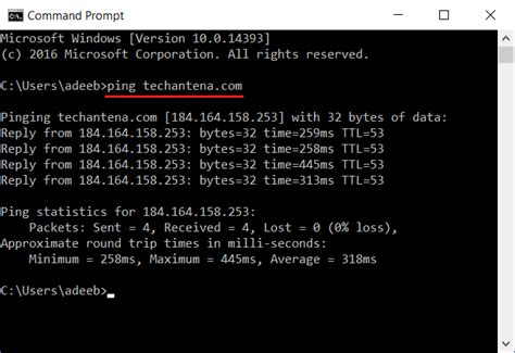 2. Type ping [destination] and press Enter. Replace [destination] with the IP address or domain name of the host you want to test.