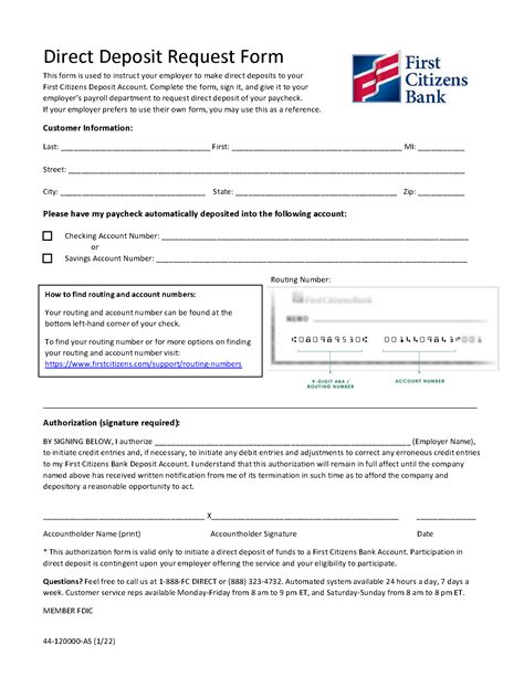 Alright, let’s get down to the brass tacks: how do you actually set up direct deposit with First Citizens Bank ? It’s usually a pretty simple process, guys, and once you’ve done it once, you’ll wonder why you didn’t do it sooner. The first thing you’ll need is your bank account information. Specifically, you’ll need your First Citizens Bank routing number and your account number. Your routing number is a nine-digit code that identifies the financial institution, while your account number is specific to your individual account. You can find both of these easily. The most common places are on one of your First Citizens Bank checks (look at the bottom left for the routing number and the numbers next to it for your account number) or by logging into your online banking account with First Citizens Bank. They usually have a dedicated section for account details where you can find this information. Alternatively, you can always call First Citizens Bank customer service or visit a branch, and they’ll be happy to help you locate these numbers. Once you have your routing and account numbers, the next step depends on who is paying you. If you’re setting up direct deposit for your salary from an employer, you’ll typically need to fill out a direct deposit form . Your employer’s HR or payroll department will usually provide this form. It will ask for your name, the name of your bank (First Citizens Bank), the routing number, and your account number. You might also have the option to split your deposit between multiple accounts, which is super handy if you want to automatically allocate funds to savings. Make sure you fill out this form completely and accurately. Double-check those numbers! If you’re receiving payments from other sources, like government benefits (Social Security, disability, etc.) or even from a third-party payment service, the process might differ slightly. You’ll usually need to contact the paying agency directly. They will have their own specific forms or online portals for setting up direct deposit. For example, if you’re setting up Social Security direct deposit, you’d go through the Social Security Administration’s website or contact them. The key is to have your First Citizens Bank routing number and account number ready when you initiate the setup with the paying entity. It’s a straightforward process that saves you tons of time and hassle in the long run. So, get those numbers handy and make the switch! It’s one of the easiest ways to manage your money more effectively and ensure you get paid on time, every time, directly into your First Citizens Bank account.