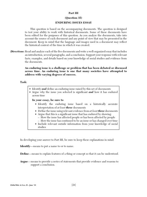 Let’s talk about the heart and soul of the June 2022 Global Regents Enduring Issues Essay : using the historical documents. This is where you prove your points and show you’ve done your homework, guys! Simply mentioning a document isn’t enough; you need to analyze the evidence it provides and connect it directly back to your chosen enduring issue. When you use a document, start by introducing it – for example, “Document 3, a photograph from the 1950s, depicts…” Then, you need to explain what the document shows and how that illustration relates to your enduring issue. For instance, if your issue is human rights violations and Document 3 shows people being discriminated against, you’d explain how this specific instance is an example of a human rights violation and how it fits into the broader historical context of such violations. Don’t just summarize the document; interpret it. What is the author trying to say? What is the significance of the image or text? Ask yourself: How does this specific piece of evidence demonstrate the historical manifestation or impact of my enduring issue? You’ll need to do this for at least three documents. Try to find documents that offer different perspectives or cover different time periods to show the enduring nature of the issue. For example, if you’re discussing conflict , you might use a document about a medieval war, another about a 20th-century revolution, and a third about a modern geopolitical dispute. Each document should serve as a concrete example that supports your overarching argument. Remember to also integrate your own historical knowledge. The documents are a starting point, but your understanding of the broader historical context is what elevates your essay. You can use your knowledge to explain the background of the event in the document, to draw parallels with other historical events, or to discuss the long-term consequences of the situation described. This synthesis of document evidence and your own knowledge is crucial for a high score. Think of the documents as pieces of a puzzle. Your job is to not only identify the pieces but also to show how they fit together to form a clear picture of the enduring issue. Guys, mastering document analysis is what separates a good essay from a great one. Focus on explaining the significance of each piece of evidence and how it contributes to your overall argument about the enduring issue.
