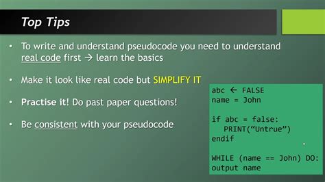 To make sure your pseudocode is as useful as possible, let’s talk about some best practices . Following these tips will ensure your pseudocode is clear, concise, and serves its purpose effectively. First off, be consistent . Use the same keywords and formatting throughout your pseudocode. If you decide to use INPUT for getting data, stick with it. Don’t switch to GET or READ halfway through unless you have a very good reason. Consistency makes it predictable and easier to read. Secondly, keep it simple and readable . Avoid overly complex sentences or jargon. The whole point is clarity, so use plain language. Imagine you’re explaining it to someone who is learning programming for the first time. Break down complex operations into smaller, digestible steps. Instead of writing ProcessData(input_file, output_file, threshold) , you might break it down into steps like OPEN input_file , READ line from input_file , IF value > threshold THEN WRITE line to output_file , and so on. Thirdly, use indentation effectively . Just like in actual code, indentation can visually represent the structure of your logic, especially for nested IF statements or loops. This makes it much easier to follow the flow of control. Fourth, use meaningful names for variables and structures . Instead of var1 , var2 , use names like user_name , total_score , or is_valid . This makes the pseudocode self-explanatory. Fifth, focus on logic, not syntax . Don’t worry about semicolons, data types (unless it’s crucial for clarity, like distinguishing between a string and a number), or specific language keywords. Concentrate on the sequence of operations, decisions, and loops. Finally, add comments where necessary . While pseudocode should be largely self-explanatory, a brief comment can clarify a tricky part or explain the purpose of a section. For example, // Calculate the square root using Newton's method . By keeping these best practices in mind, your pseudocode will become a powerful asset in your programming toolkit, helping you design, communicate, and debug your code more effectively.