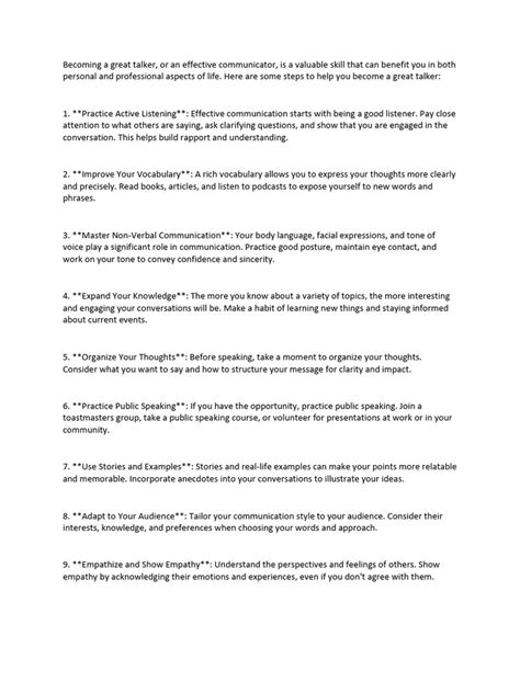 • Active Listening : This isn’t just about hearing; it’s about understanding and responding thoughtfully. It involves paying attention to the speaker, asking clarifying questions, and showing empathy. Think about the most engaging conversations you’ve had. Chances are, the other person was an active listener, making you feel heard and valued. Empathy is a huge component of active listening. Put yourself in the other person’s shoes, try to see their perspective, and show that you understand their feelings and experiences. TED speakers often use this approach to build connections with their audience, sharing stories that resonate on a deeper level. Active listening isn’t just a skill for one-on-one conversations. It is crucial for group interactions, and is critical to negotiation and conflict resolution. By actively listening, you are able to understand the needs, concerns, and interests of the other parties involved, which allows you to build stronger relationships.