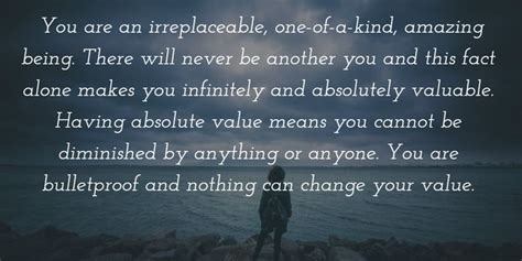 Practice self-compassion . Be kind to yourself. Treat yourself with the same compassion and understanding you would offer a friend. Remember that everyone makes mistakes, and everyone faces challenges. By treating yourself with kindness, you promote your mental and emotional well-being. This self-care is vital to help you understand your irreplaceable value .